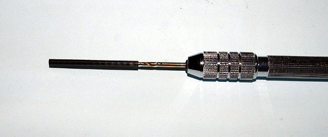 破断部を外側から補強するアウターパイプを加工します。整形した破断部の外形より若干内径の小さなパイプを選定し、ドリルの刃や極細丸ヤスリで少しずつ内径を広げていきます。工具は腕時計修理用のものが便利です。 |
