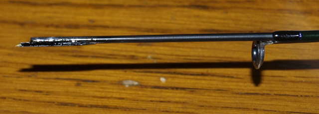 | よくあるケースですが、 最も難しいのがこの竿先の接ぎです。バット付近の接ぎは楽勝です。接ぎの部分が細くなるほど難しいと感じています。 但し、竿先を別のものを流用する場合は、2番ガイドを外し、そこで接ぐという方法があります。この場合は接いだ後、その上にガイドを取り付けスレッドを巻くことでその部分を隠すと同時に補強します。 |
